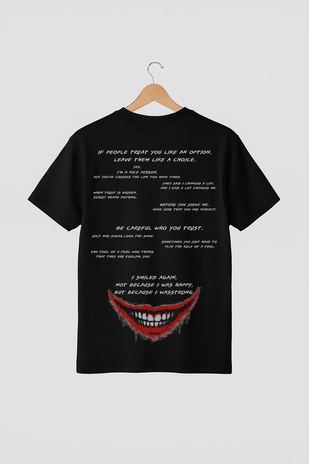 Affirme ta personnalité avec ce t-shirt noir unique, orné à l’arrière de puissantes citations inspirées du Joker :